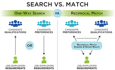 Unlike traditional keyword searching that's one way, Real-Time Job Matching is reciprocal. Our proprietary matching technology not only scores and ranks candidates based on their skills and experience in relation to the job requirements, but also preferences and interests on both sides of the hiring equation.